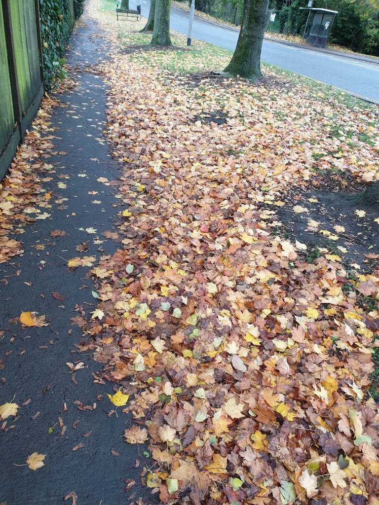 I keep having to consciously slow down in order to give the leaves time to work on my mood but it’s counter-intuitive when I can feel myself developing trench foot with every step. My head says walk faster and get out of the rain. My heart says much the same but is trumped by my bloody-mindedness. I walk at a defiant snail’s pace.