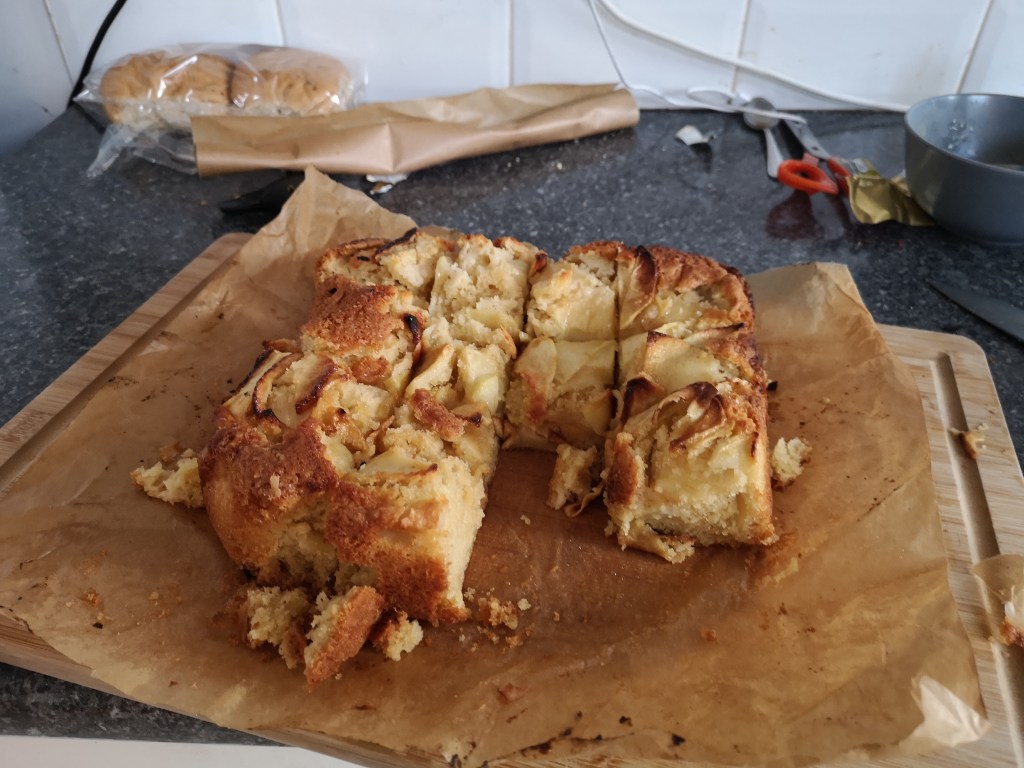 What isn’t fine though is that I run out of mixture with about a quarter of the second cake mix layer to go. I try to cover up as best I can, pour over the rest of the apples, shrug and bang it in the oven. It’s not gone great but it’s my first time. As long as I can eat it without stomach cramps it’ll be a victory.