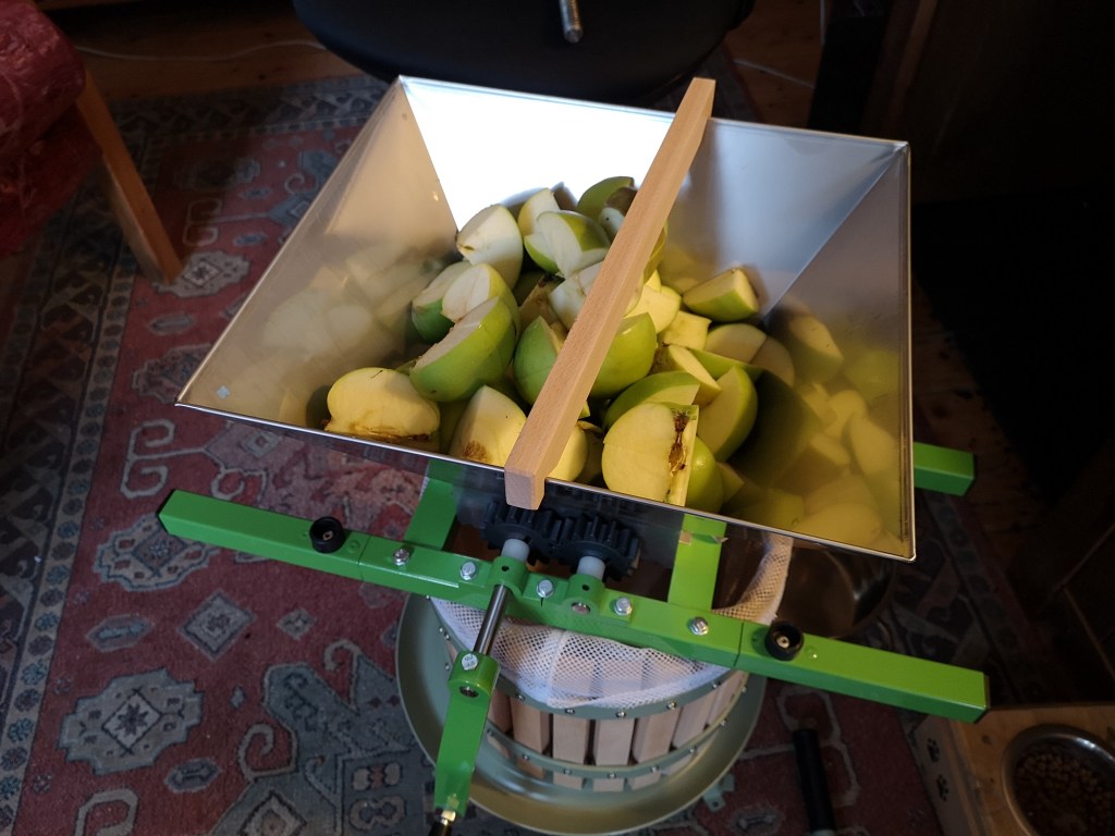 For my first attempt, I stick with the patented (not really) Jack Hargreaves recipe of 40% cooker to 60% eater. In the instructions they bang whole apples into the crusher but I find that to be shockingly inefficient. Instead of falling into the rotating jaws, the apples just bounce around on top and I get nowhere. No worries; I’ll just cut them into chunks.
