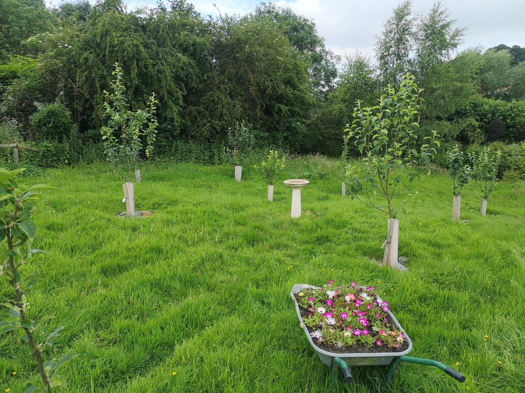 Much of the day-to-day tree husbandry has fallen to Barb, to take place during her occasional teabreaks from picking up horse poo. She has maintained her own plan of the orchard and even added some decorative flowers in a wheelbarrow. To settle any potential disagreements about the layout, I dug up my original envelope-based list of which tree is planted where. We compared lists and it turns out that they’re both the same. I still don’t like her newfangled edition though: lists should be scribbled on scraps of paper not neatly drawn out and almost to scale. Everyone knows that.