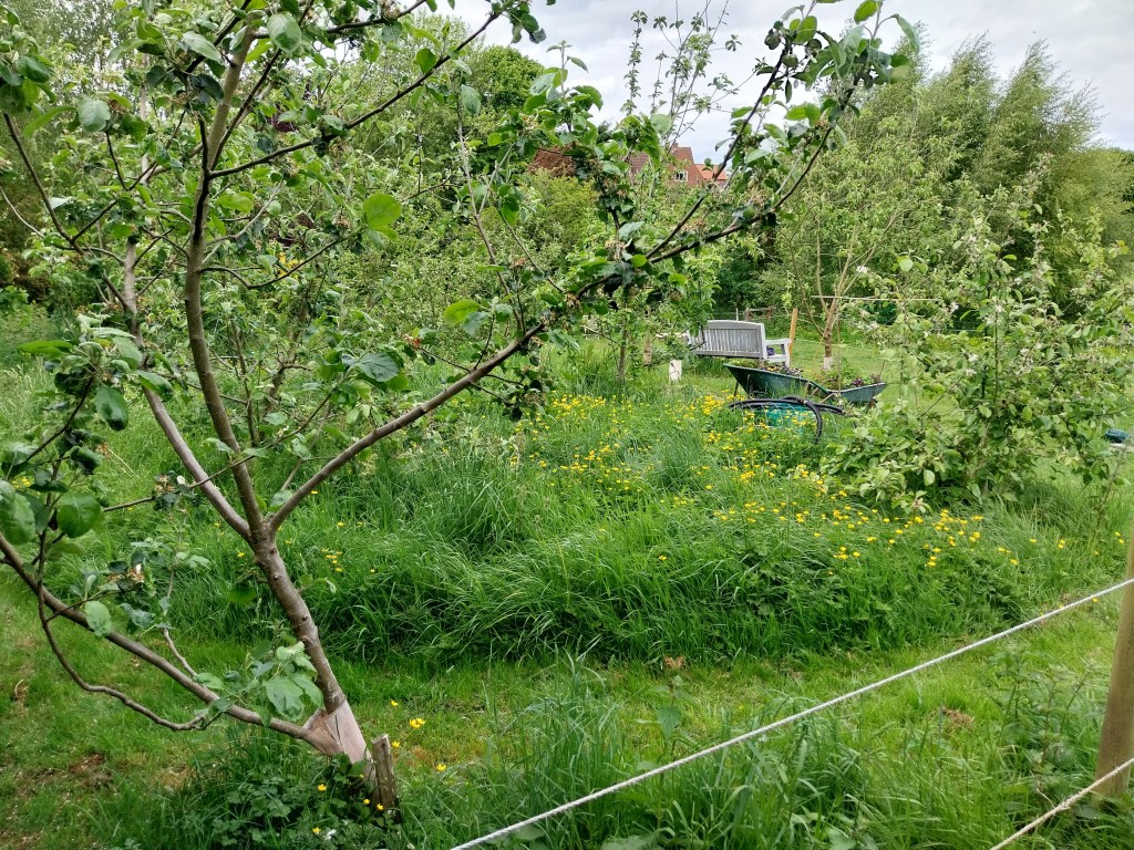 I’m shocked by how much Peasgood Nonesuch has grown, easily outstripping the intended constraints of its dwarf roof stock. Shorter trees make for easier harvesting but some of mine will be the sole preserve of migrating birds unless I manage to drag a step ladder down the road. Dr Clifford glowers in the corner, reminding everyone of his seniority. He was three when I planted him so he will be nine in the Autumn. Next year I’ll have a party. He’s not as tall as Peasgood but his branches are thick and gnarly, lurching sideways where Peasgood is all about self-aggrandising elevation. Ingall’s Red looks more traditional, almost as if it was me that pruned it and not invading rabbits. My heart swells with pride when I remember what a state they left him in. Buck-toothed gits.
