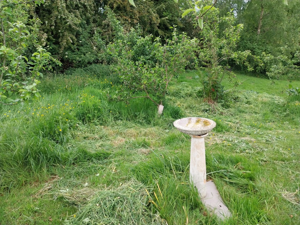 With almost a tenth of the grass mangled in one fashion or another, I call it a day and make unlikely plans to return soon. There must be other orchard jobs that are less knackering.
